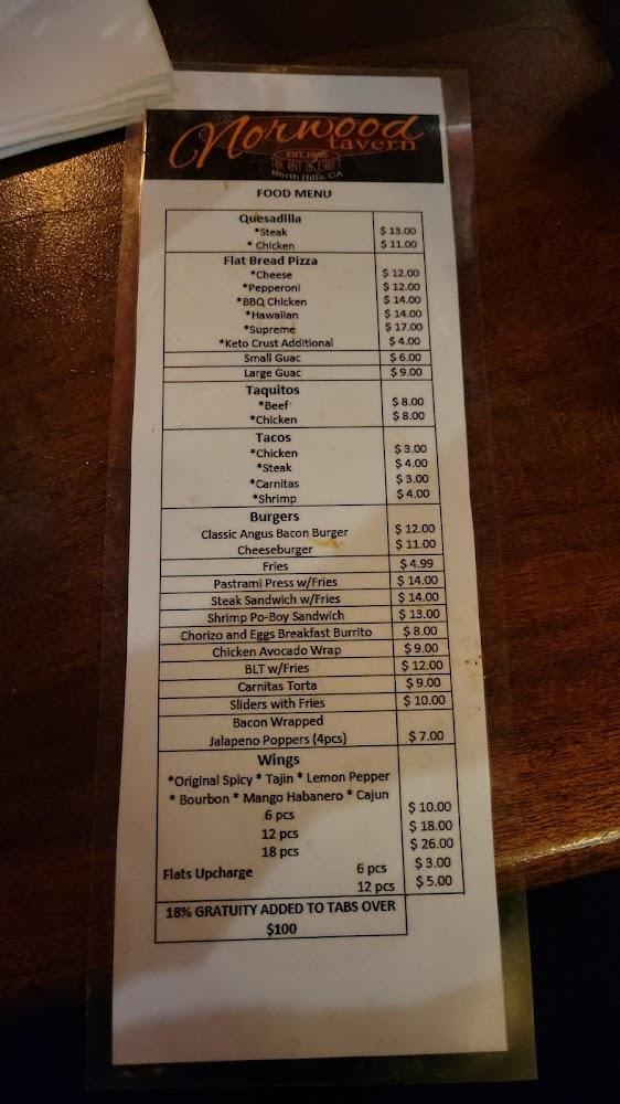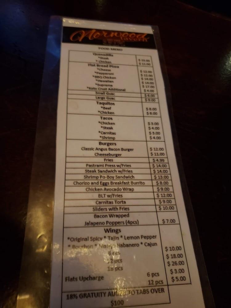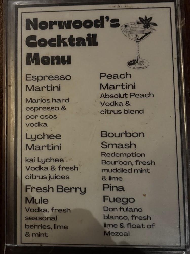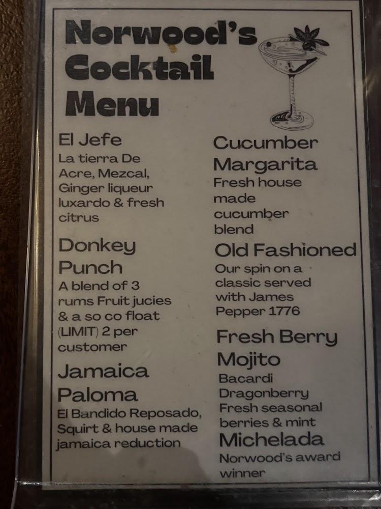 Norwood offers a delightful menu focused on classic bar favorites, featuring burgers, wings, and tacos. The flatbread pepperoni and chicken baja tacos are crowd-pleasers. Sweet desserts like churros and cheesecake add a finishing touch. With an average price range between $10 to $20, it caters to various tastes and budgets, making it accessible for all. Diverse drinks complement the food, ensuring a well-rounded dining experience.